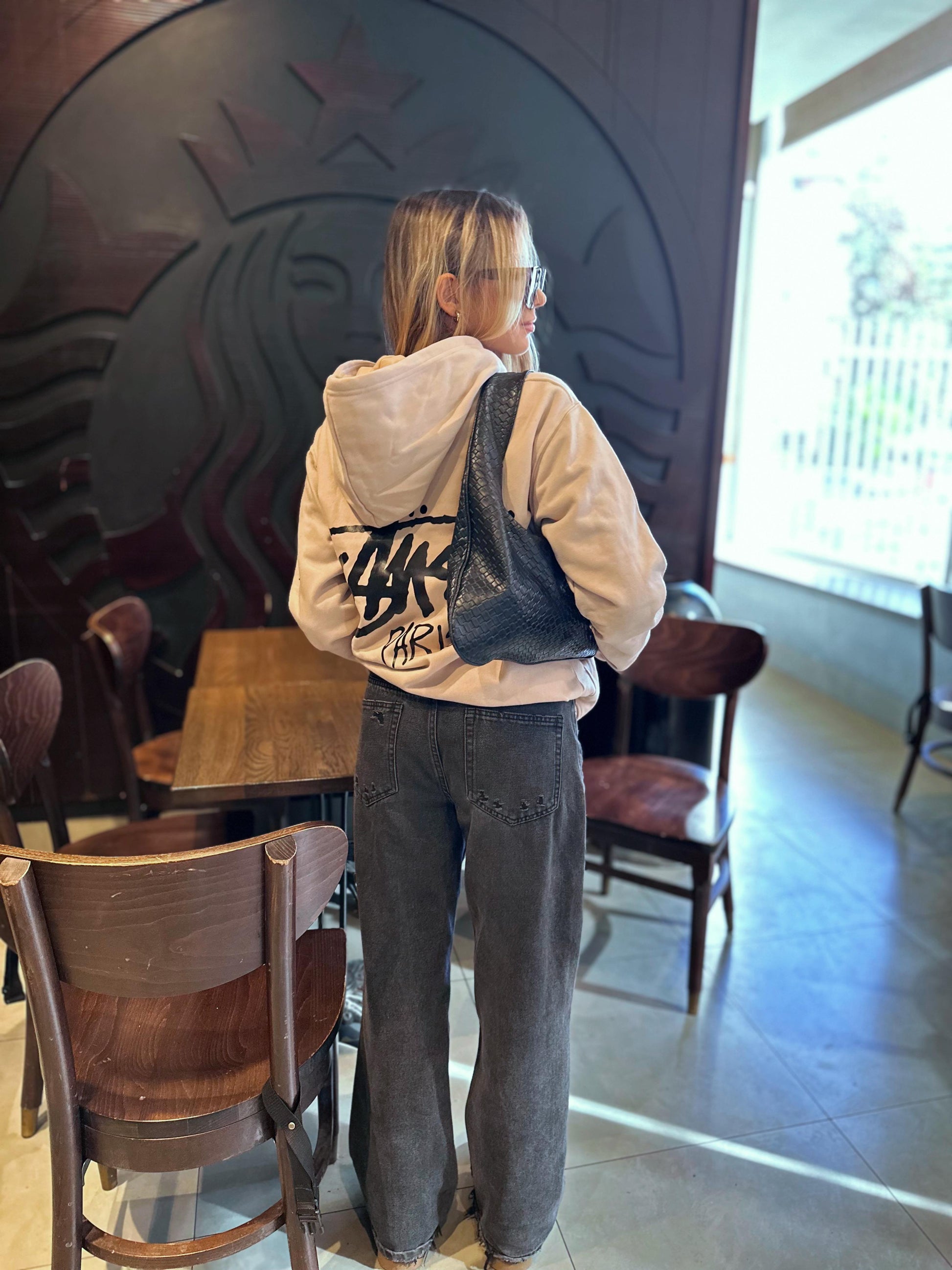 Diseñado para quienes aman lo comfy pero no quieren pasar desapercibidas, este modelo tiene una capucha con cordón, bolsillos delanteros amplios y un estampado blanco en la espalda con la frase "Stussy Paris" que le da un toque urbano y con actitud.